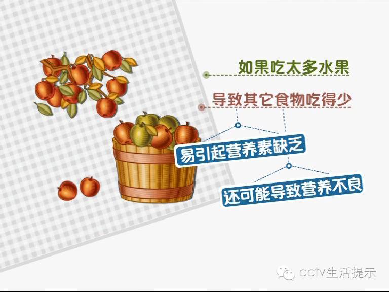 如果吃太多水果,而导致其它食物吃得少,很容易引起蛋白质等营养素的缺乏,长期下来还可能导致营养不良。