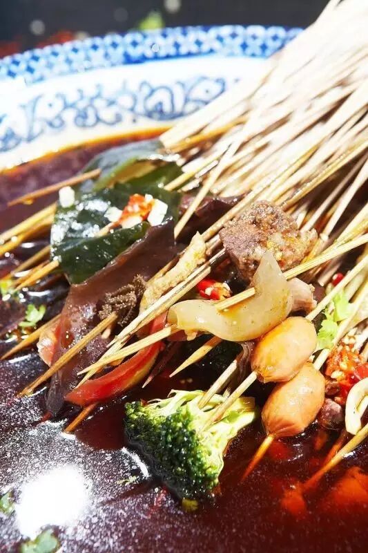 食柜里,整齐放着几十个品种的竹签,每一种都串着当季的美食,嫩鲜的如青笋尖、海带、豆皮,还有成都女孩子最爱的土豆片。此外,一些从历史传袭而来的菜品,如毛肚、鸭肠,还有我最爱的兔腰。每一串的份量都恰到好处,丰简由人,各取所爱。