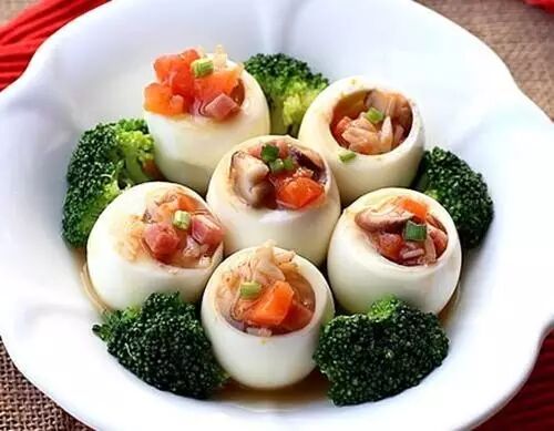 ④ 将捞空的蛋摆在盘中,边上用焯熟的西兰花做装饰,将炒好和杂丁装入鸡蛋盅;