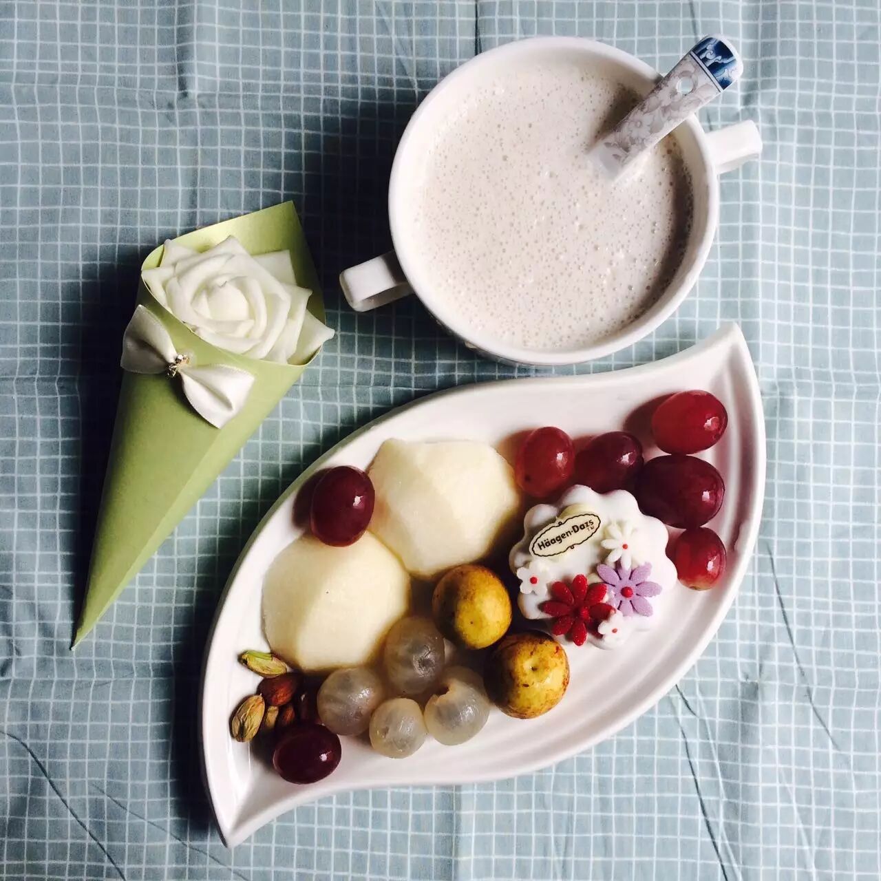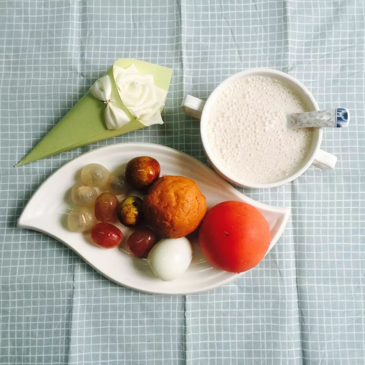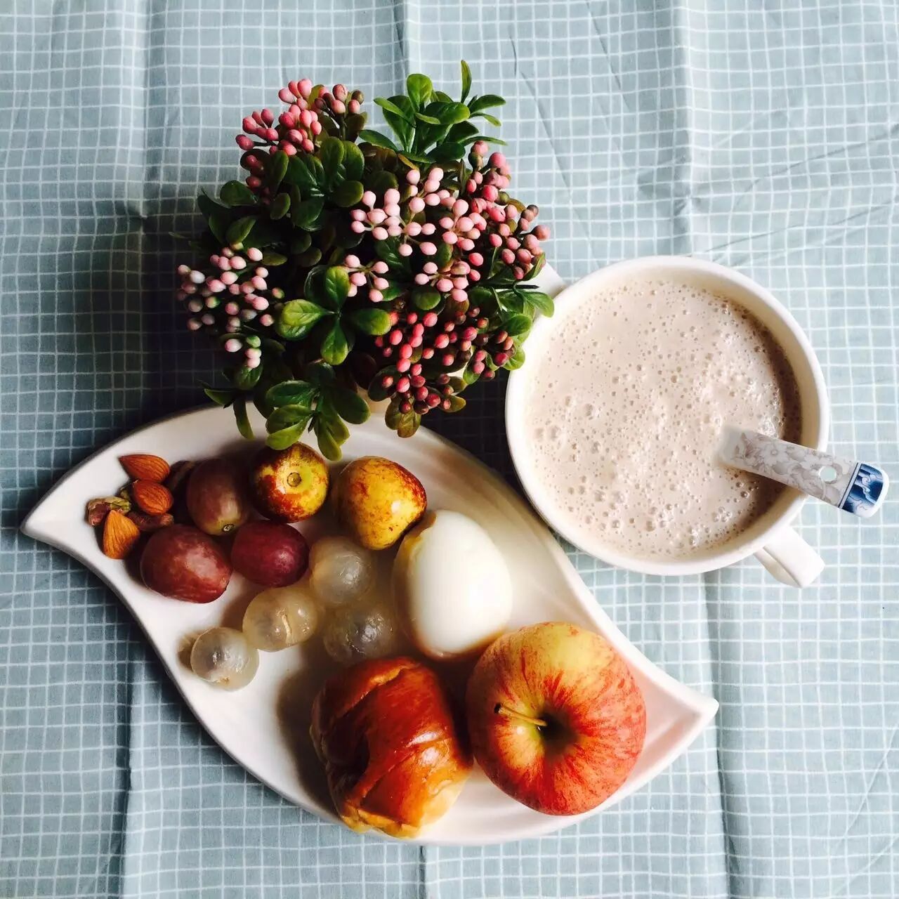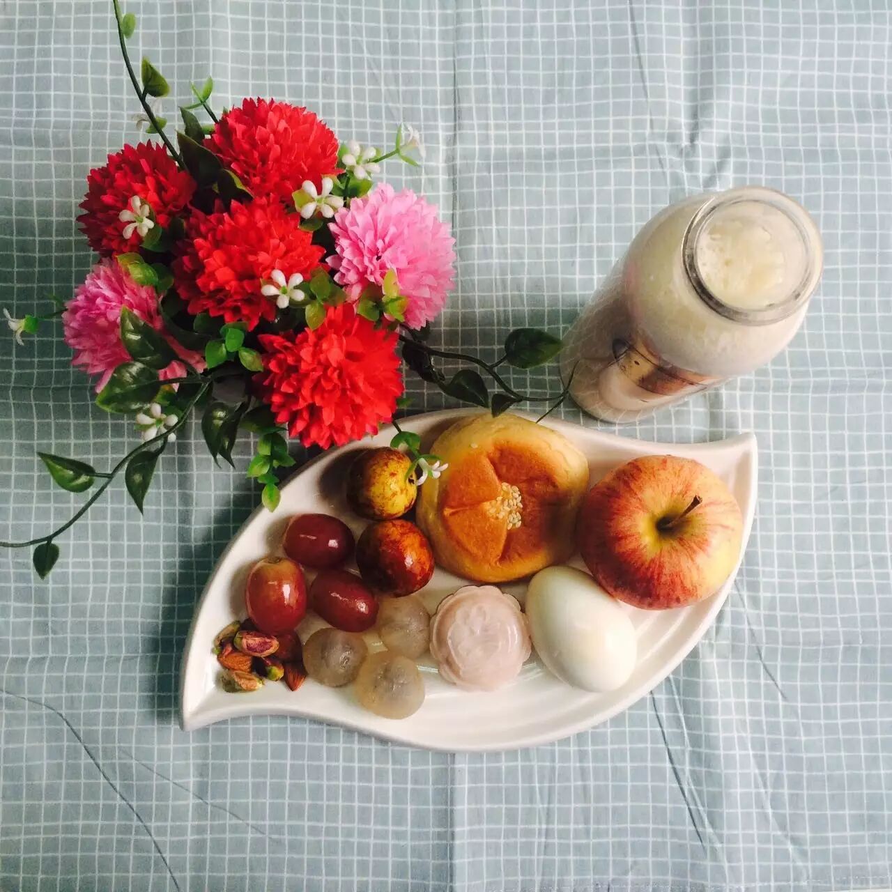 #薇·晒早餐#我的早餐(香蕉养乐多牛奶奶昔、提子、小苹果、龙眼、冬枣、开心果、杏仁、鸡蛋、小面包、自制火龙果冰皮月饼)。【感悟分享】如果每个人在成长的路上都能碰见好老师世界将更加美好,祝福天下所有老师节日快乐!