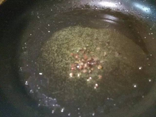 4、锅内剩下的油,只要少许即可。放入花椒,中火爆香,等炸出花椒香味了,把花椒过滤掉,留下底油开始炒调味料。