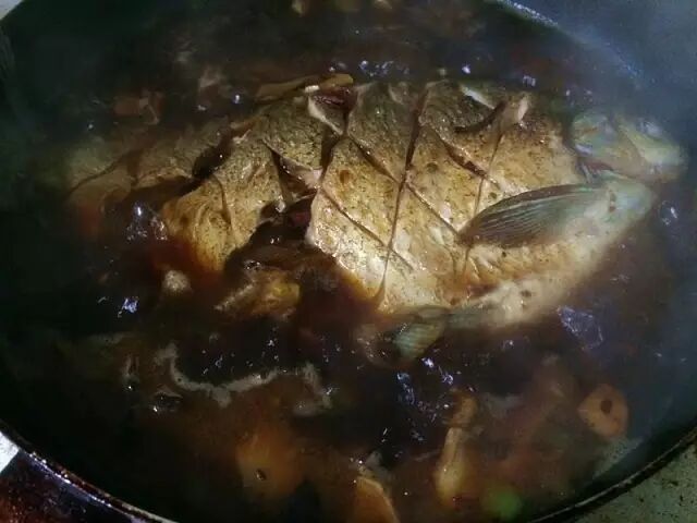 6、放入鱼,加入将将盖过鱼的温开水,然后倒入酱油、醋、料酒。大火烧开之后,再放入适量糖和少许盐,转为小火,10分钟左右就可以了。爱吃辣椒的,可以放入几个干辣椒。
