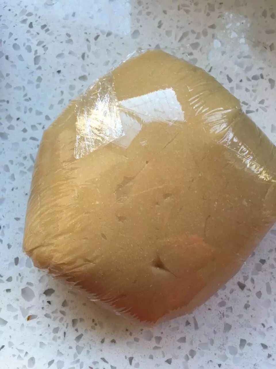 花生油、转化糖浆、枧水,加入面粉、吉士粉、奶粉,活面团,裹保鲜膜静置2小时。