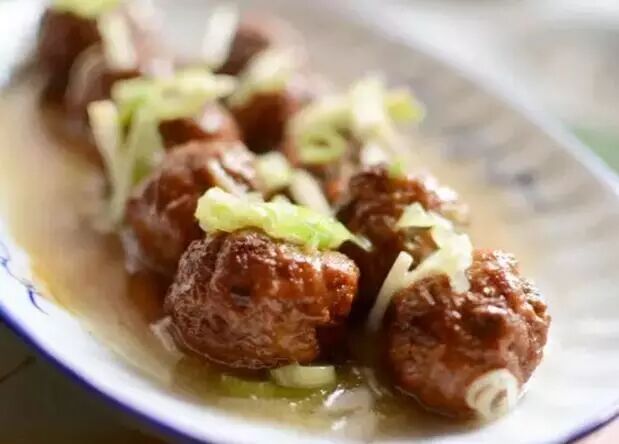 4、锅中留少许底油,油热后放入姜片、葱结,炒出香味后倒入肉丸,放入盐、白糖、生抽、老抽,大火煮开后撇去浮沫,小火,加盖煮15分钟左右至熟透。放入鸡精,搅匀。