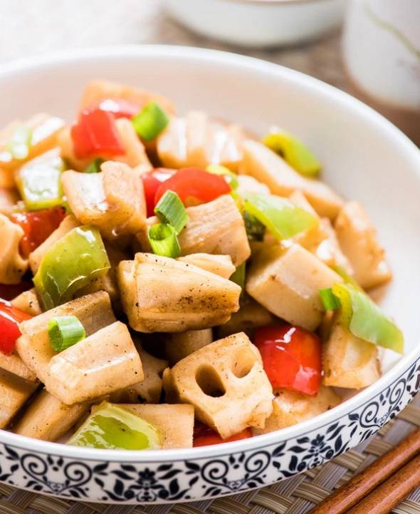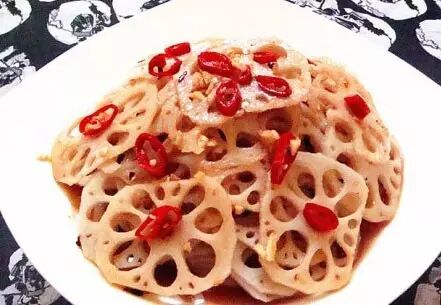 2、炒锅置旺火上,倒入油3汤匙,烧至温热,下葱末、姜末、酱油、糖、醋和少量水,加入藕片翻炒,用淀粉勾芡,淋入花椒油,出锅即可。