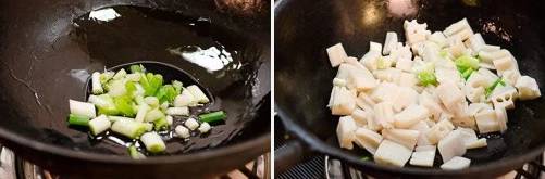 6、锅内放入少许油,小火炒香花椒和干红椒,再炒蒜粒和蒜苗