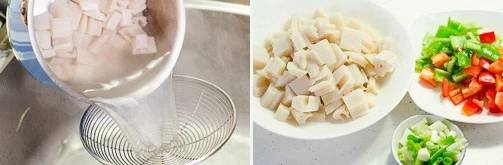 2.用热水焯一下藕丁,约一分钟,可以使炒出来的藕丁更脆。