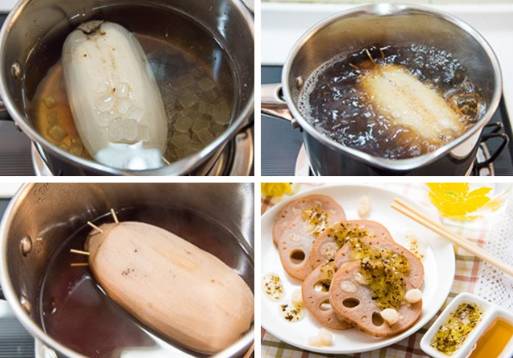 3.在锅中加入冰糖、红糖、水和莲藕,先开大火,煮的过程中进行搅拌,使糖融化;等糖都融化后,转中火煮30分钟,保持水一直是沸腾的;最后用小火焖20分钟,这之间要记得给莲藕翻面。煮好后放在室温下冷却,完全冷却后再切片。