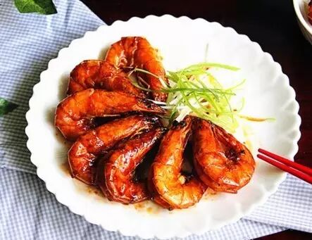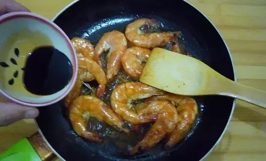 第五步,煎制鲜虾变色放入姜丝继续煸炒出姜丝香味。(一边煸,一边用手铲压虾头,这样可以煸炒出虾头中红油)