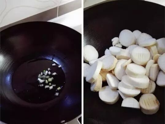 第三步,炒锅放适量的油,温热时放入香葱的葱白,放入杏鲍菇翻炒。