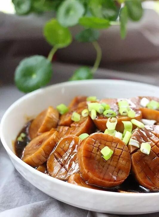 第六步,炖约5-6分钟,汤汁变少,倒入水淀粉搅匀,收至汤汁浓稠时,起锅装盘,撒上余下的香葱即可。