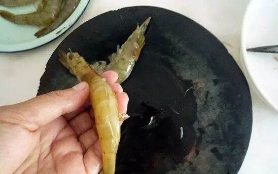 第二步,鲜虾洗净剪去虾脚虾枪,并从虾背处刨开去除虾线。