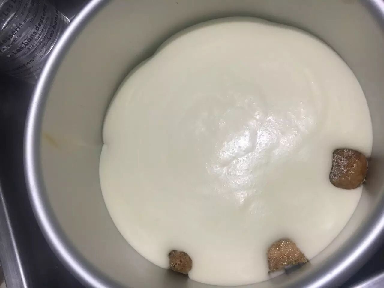 7.手指饼干沾取咖啡酒,平铺于6寸蛋糕模具底部。