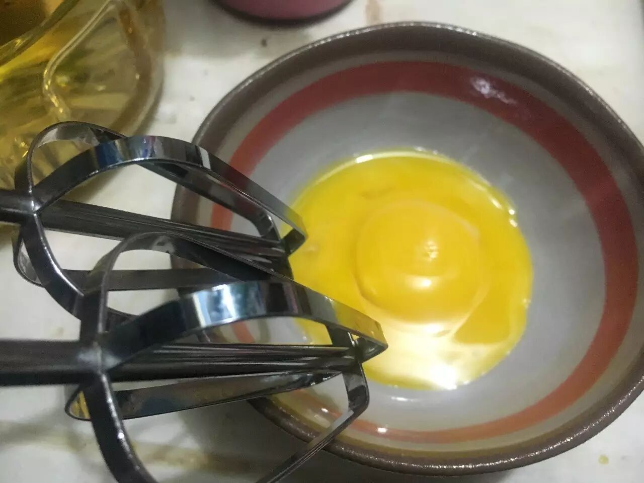 2.蛋黄用打蛋器打发到浓稠的状态。