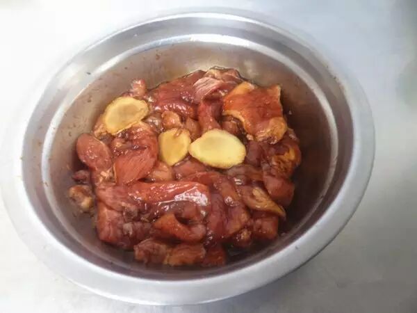 第五步,加姜片,搅拌均匀,让肉片均匀裹上料汁,放入冰箱腌制4小时