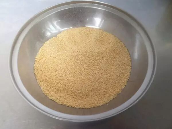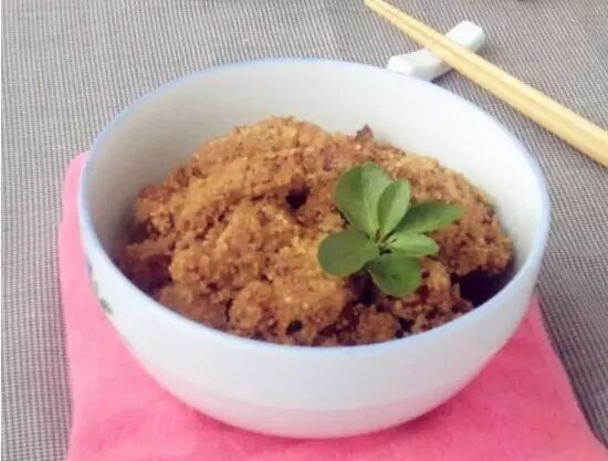 第七步,小米碎倒入腌制好的肉片中,让肉片均匀裹上小米粉