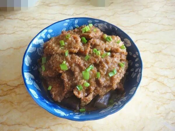 第三步,猪肉切成均匀的薄片后加入料酒、甜面酱和蒸肉粉抓匀,茄子切段后加入盐拌匀各静置30分钟