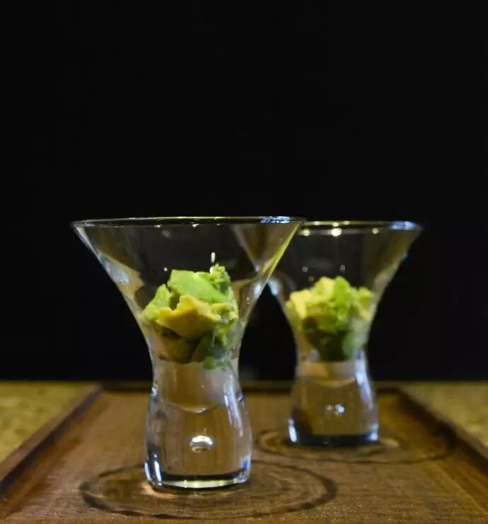 ● Step 6 | 万事俱备,开始装杯:最底层铺一大勺酱,再用大金属勺挖1/4个牛油果铺上;勺子沿着果皮走,应该很轻松就能把划了花刀的果肉取出来