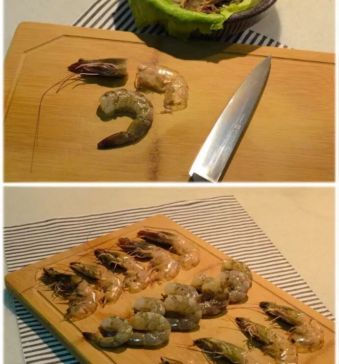 ● Step 1 | 用鲜虾的把虾头和虾身分开,把虾壳剥到只留下连着尾巴的最后一节(吃的时候捏着这里),小刀划开虾背抽去泥线