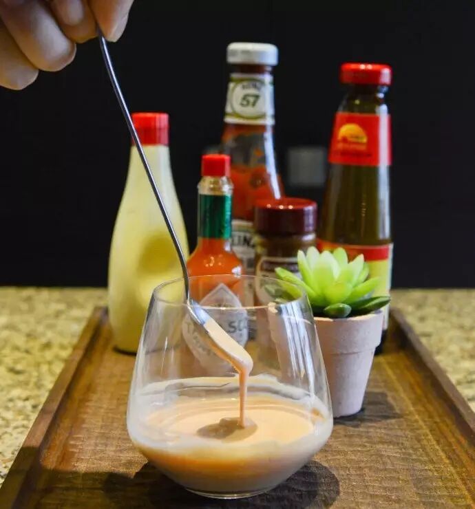 ● Step 4 | 主角鸡尾酱:在碗里按4:1的比例放入蛋黄酱和番茄酱,加一点Tabasco刺激一下, 重口味的放点辣椒粉,再加一小勺蚝油提味,搅拌均匀,外表粉嫩内心热辣的酱汁就好了【有白兰地的话加一小勺,这才是最正宗的配方;但谁没事儿家里囤着白兰地呢?】