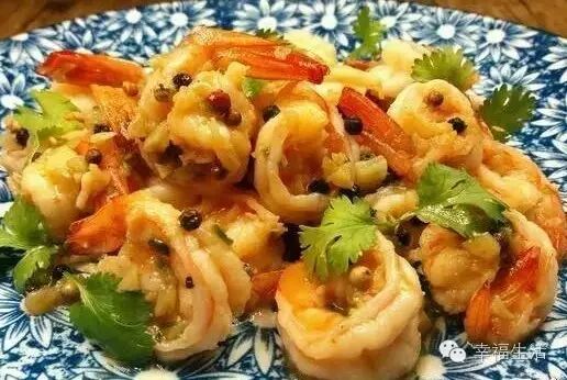 大虾500克、蒜9瓣、香菜20克、色拉油30克、彩色胡椒10克、鱼露15克、白糖10克、现磨彩色胡椒少许