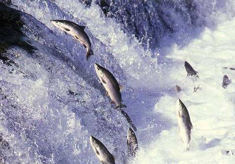 看到这幅图片有没有一种鲤鱼跃龙门的感觉呢?这可是非常著名的“冰海之皇”三文鱼!三文鱼也叫撒蒙鱼或者是萨门鱼,学名鲑鱼。每年十月初,成熟的三文鱼浩浩荡荡的集结开始回家的旅程。自进入河口开始,它们就不再吃任何东西,全力赶路,逆流而上将会消耗掉它们几乎所有的能量和体力。它们要不断从水面上跃起以闯过一个个急流和险滩,克服种种困难,躲避无数危险,在生命的最后时刻,逆水搏击,回游产卵,为自己的生命划上句号。犹如一场以生命为乐章的华尔兹,绚丽而悲壮。