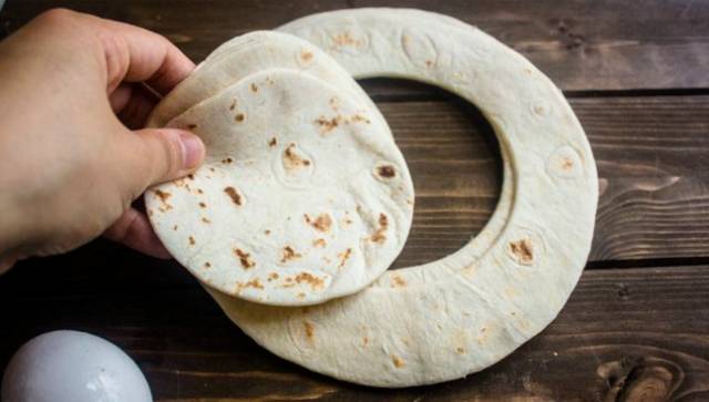 1. 烤箱预热到150度,烤盘内摆好圆形烤模,并在烤模上刷上一层植物油。玉米饼切成合适大小的圆形,放入烤模中。