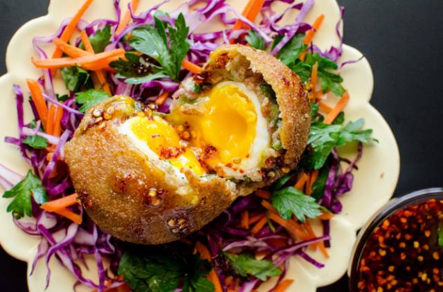 4. 平底锅内放入适量植物油烧热,放入鸡蛋小心煎制,直到外壳酥脆。
