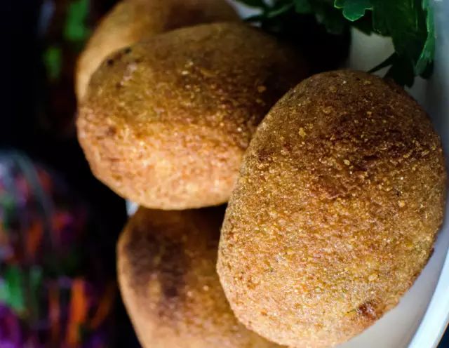 原料:鸡蛋,瘦肉,土豆,胡椒粉,香葱,植物油、面包屑