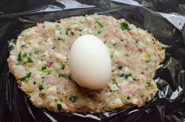 2. 将煮熟的鸡蛋剥壳,在鸡蛋外面均匀地裹上一层1cm厚的土豆瘦肉泥。