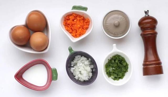 原料:鸡蛋,切碎的蔬菜(可自选口味),切碎的洋葱,切碎的香葱,盐,胡椒粉,植物油,牛奶