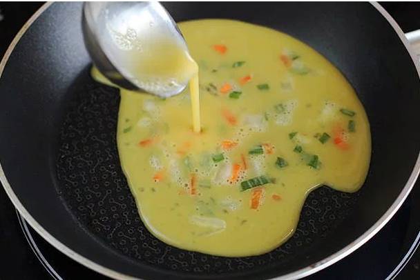 2. 将鸡蛋打入一个碗中,加入切碎的蔬菜,洋葱和香葱,再加上食盐,胡椒粉,牛奶,拌匀。平底锅烧热,在锅底均匀地刷一层植物油。将蛋液倒入平底锅并抹匀。