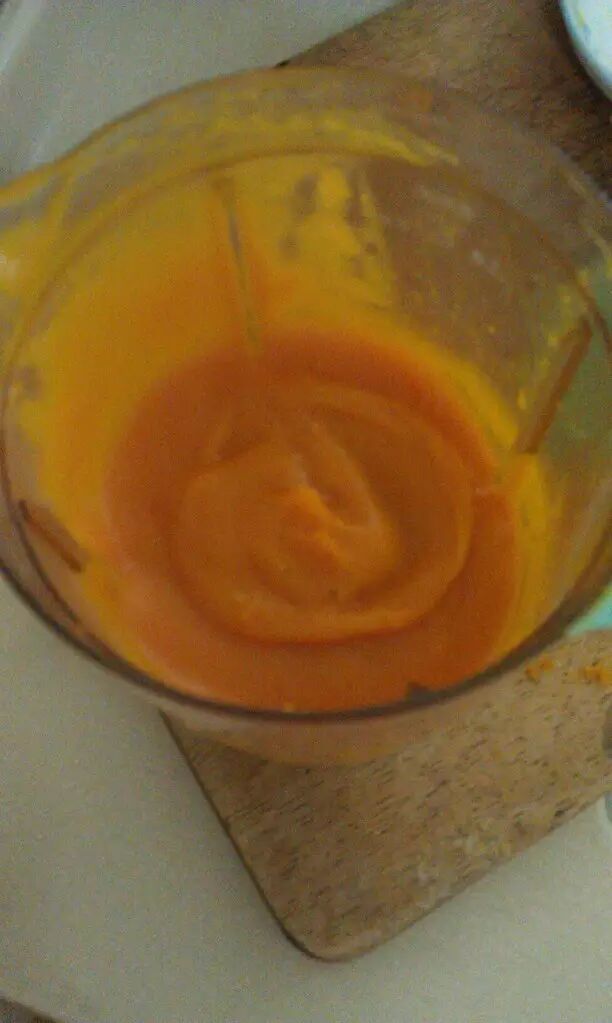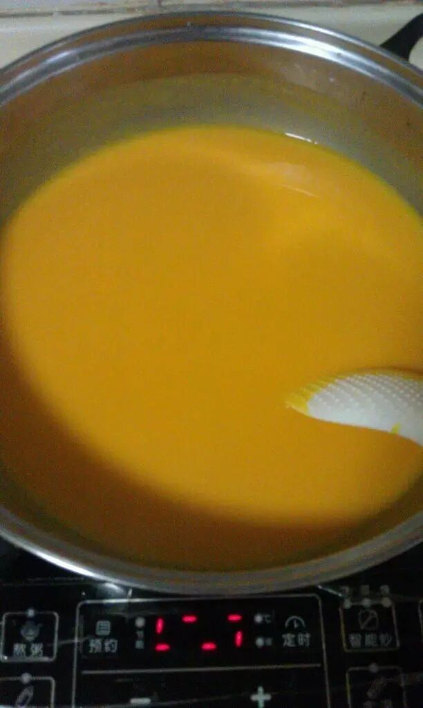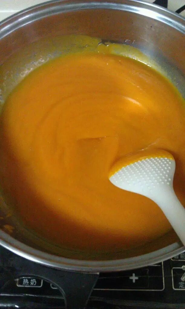把南瓜糊加水倒进锅里开小火,不停搅拌,不然会粘锅。