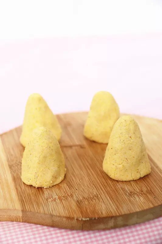 4.将窝头上端捏成尖形,直到窝头捏到0.3厘米厚,且内壁外表均光滑。