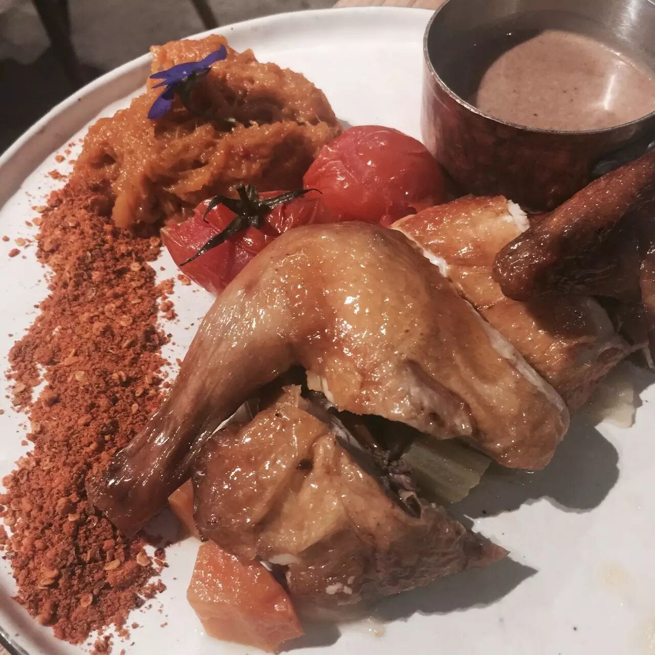 ▲烤三黄鸡(半只),份量较少,味道不错,可以根据自己的口味选择酱料搭配,推荐。