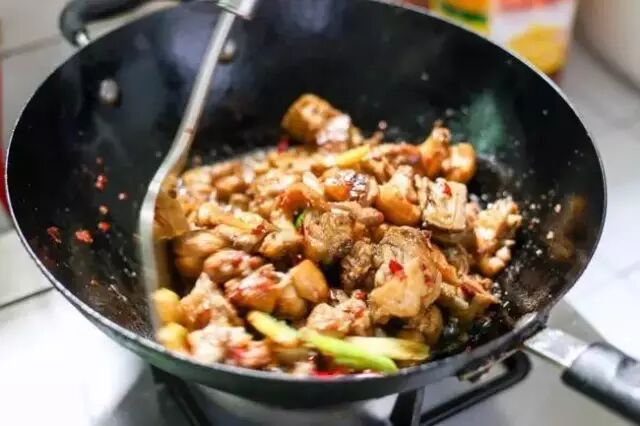 3.开中火,油热后加入鸭肉,翻炒6到8分钟,这个过程中鸭皮的脂肪慢慢释放,鸭肉开始变色,最后加入生姜片去腥味