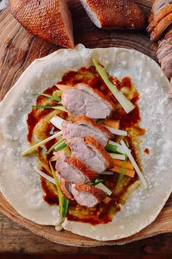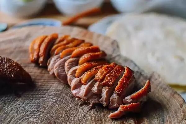鸭胸肉、1 /4茶匙盐、1茶匙淡酱油、1茶匙绍兴酒、掐五香料粉、1汤匙油。面饼(两杯面粉、一撮盐、2 / 3杯开水、1茶匙油)。配菜(黄瓜、葱、大葱、酱料)