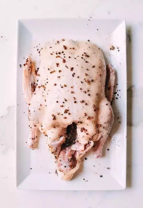 1.用冷水冲洗鸭子,里外都要冲洗干净。干锅翻炒盐和花椒,大约3到5分钟,炒到盐的颜色有点变黄就可以了。将炒好的盐和花椒涂抹在鸭子的身上,鸭子的内部也要填上,涂好后放入冰箱冷藏3小时,可以晚上腌好后,隔天做~