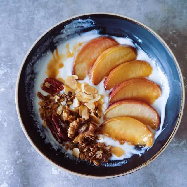 燕麦+酸奶+黄桃+烤过的杏仁片、核桃仁+枫糖