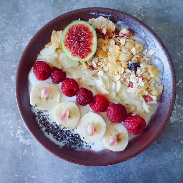 燕麦+酸奶+杏仁片+香蕉+奇亚籽+树莓+无花果