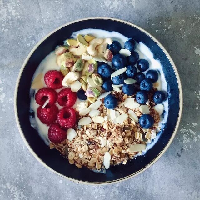 燕麦+酸奶+蓝莓+杏仁片+树莓+开心果+腰果