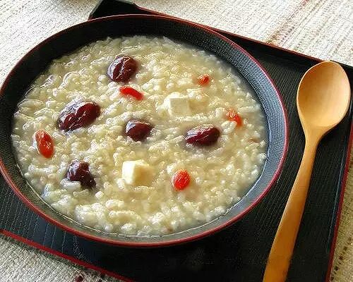制法:取粳米100克,淘净;粳米100克、茯苓粉20克一起放入锅中,加入适量水,调至武火将水烧沸,水开后转用文火熬至糜烂,然后加入盐、生姜粒若干,搅匀 即成。每天早晚各服用一次,根据口味可加入红糖。