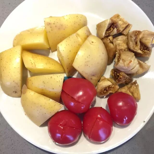 把无花果每颗切开一分为二,土豆切大块,番茄划开十字备用