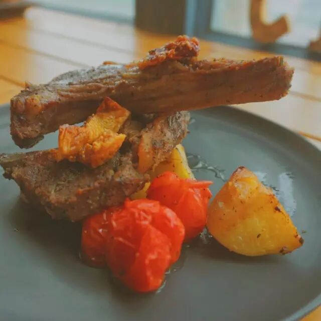 锅不用倒掉油,大火热锅后,放入土豆和番茄稍煎香,撒入一小撮盐和黑胡椒,炒匀后装出与羊排放一起