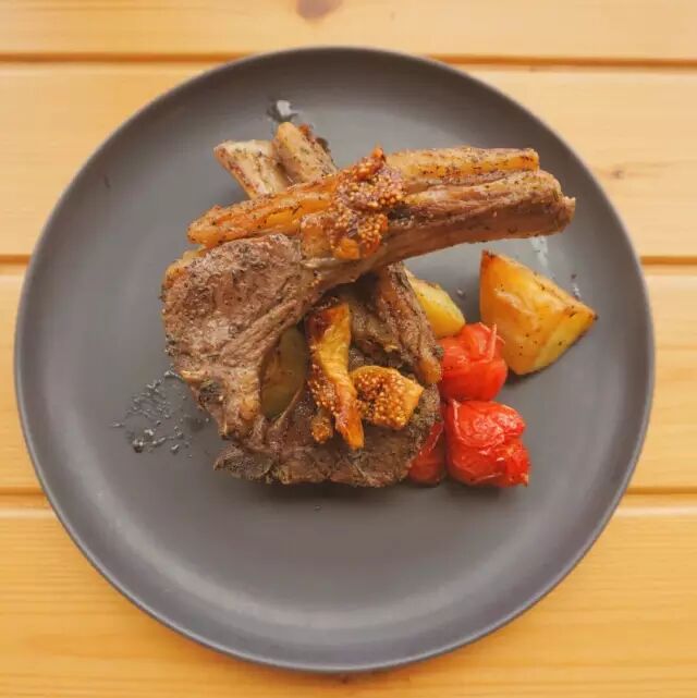 烤箱提前180度上下火加风扇预热20分钟。把无花果放在羊排上,把烤盘放进烤箱,用180度烤10分钟