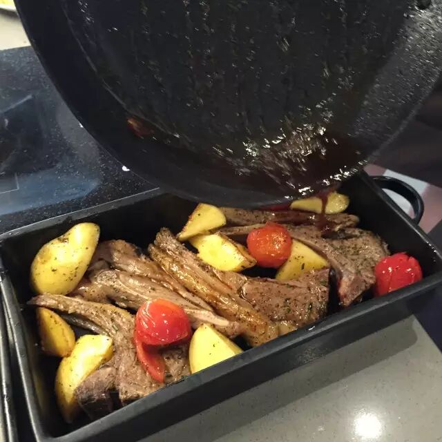大火热锅后倒入橄榄油,转中火放入羊排,注意先把有脂肪的一面朝下,煎至两面金黄后装入小烤盘备用