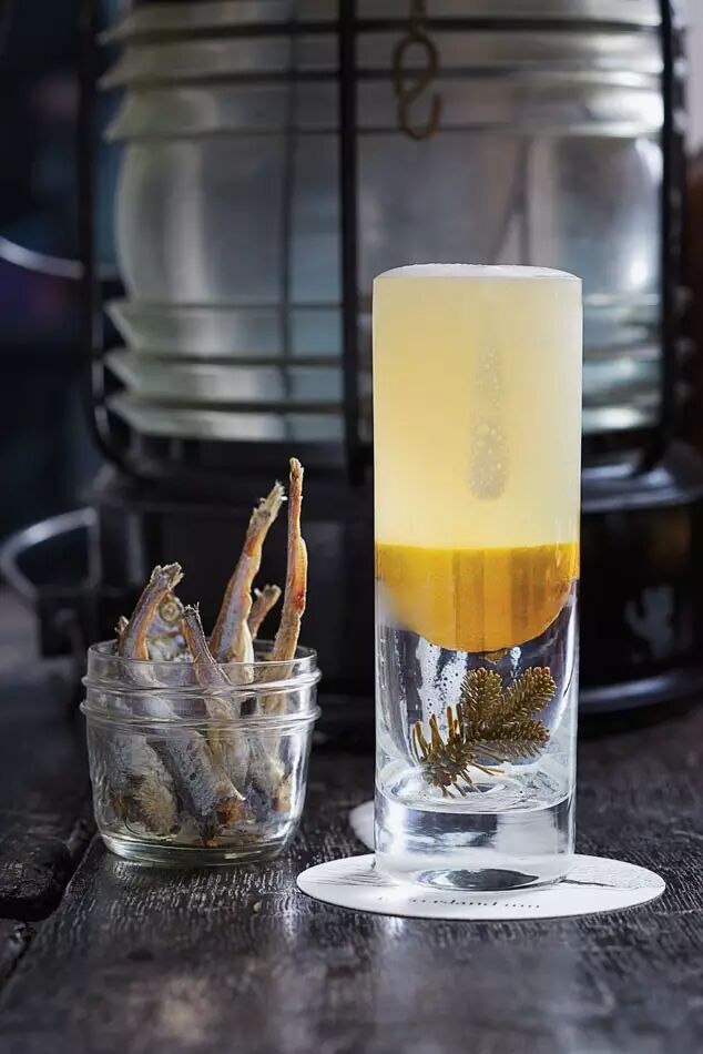 纽芬兰和拉布拉多省的福戈岛(Fogo Island)(这是一座仿佛只有红尘与你作伴的岛,感兴趣请点哦),一直以极富艺术感和设计感的建筑著称,其中相当有名的一座叫做Fogo Island Inn,这是一座在Iceberg Alley的悬崖上面遗世而独立的五星级酒店,同时也经营一家“奇思妙想”的酒吧。调酒师从很久以前伐木工人的饮食习惯中攫取灵感,调制出一款以伏特加为基酒,以云杉叶芽和姜汁糖浆为调味的鸡尾酒。试想坐在燃烧木柴的壁炉旁边,看着这只酒杯中的松针轻微飘动,眼前巨大落地窗外海浪拍打着礁石,你的思绪随着松香和酒香,飘到哪里去了吗?BTW,这家酒吧调酒用的冰块季节允许的时候,也都是取自真正冰山哦。