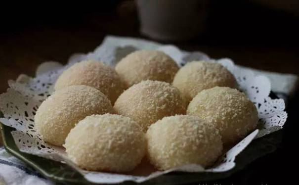 6.裹入事先切好的芒果丁;包起,捏紧收口;将糯米滋放入椰丝中滚一圈,用手略略压实即可。
