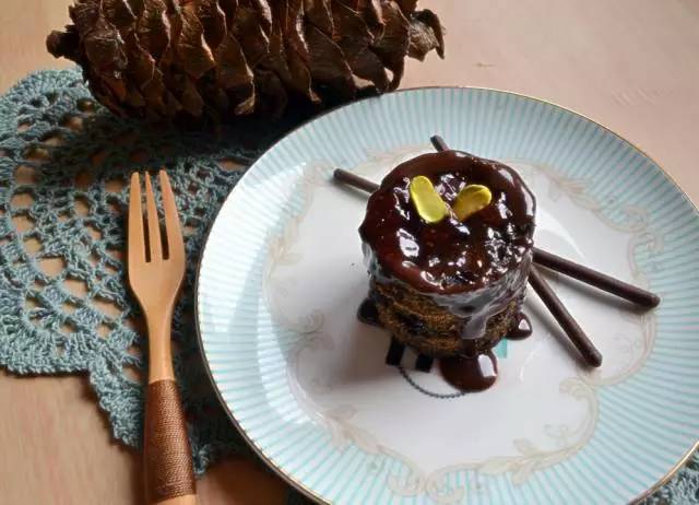 5.在每一片蛋糕上涂上草莓酱!(可以不涂直接吃)将蛋糕叠加起来,淋上巧克力炼乳!稍装饰!可以吃了!