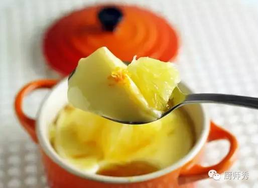 10.把30克糖放入不粘小锅中,熬至焦糖化时,再从火上移开,加入温水10ml,搅拌成焦糖酱。把焦糖酱倒在布丁碗里,加入切小块的酸橙即可。